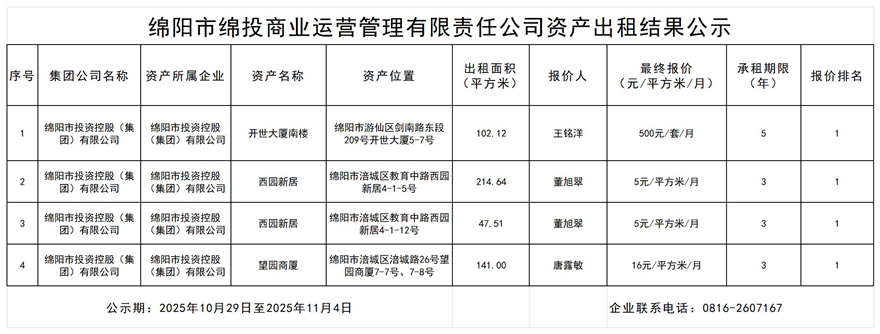 綿陽市綿投商業(yè)運營管理有限責任公司資產出租結果公示