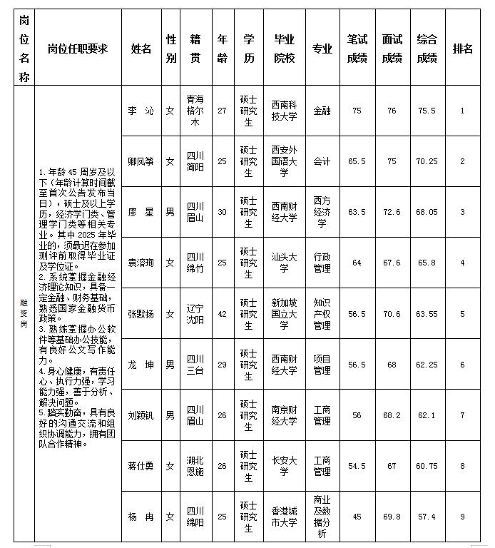 【公開招聘】綿陽金控投資管理有限責任公司關于招聘融資崗測試成績的公示