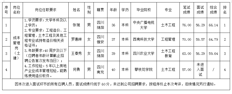 根據(jù)綿陽(yáng)市綿投置地有限公司發(fā)布的招聘公告及招聘相關(guān)規(guī)定,經(jīng)筆試、面試等程序,現(xiàn)將筆試、面試成績(jī)予以公示。