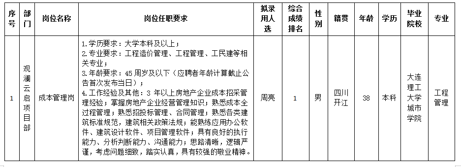根據(jù)綿陽市綿投置地有限公司發(fā)布的招聘公告及招聘相關規(guī)定,經(jīng)筆試、面試、考察、體檢等程序,擬錄用周亮同志到綿陽市綿投置地有限公司工作,現(xiàn)予以公示,具體情況如下: