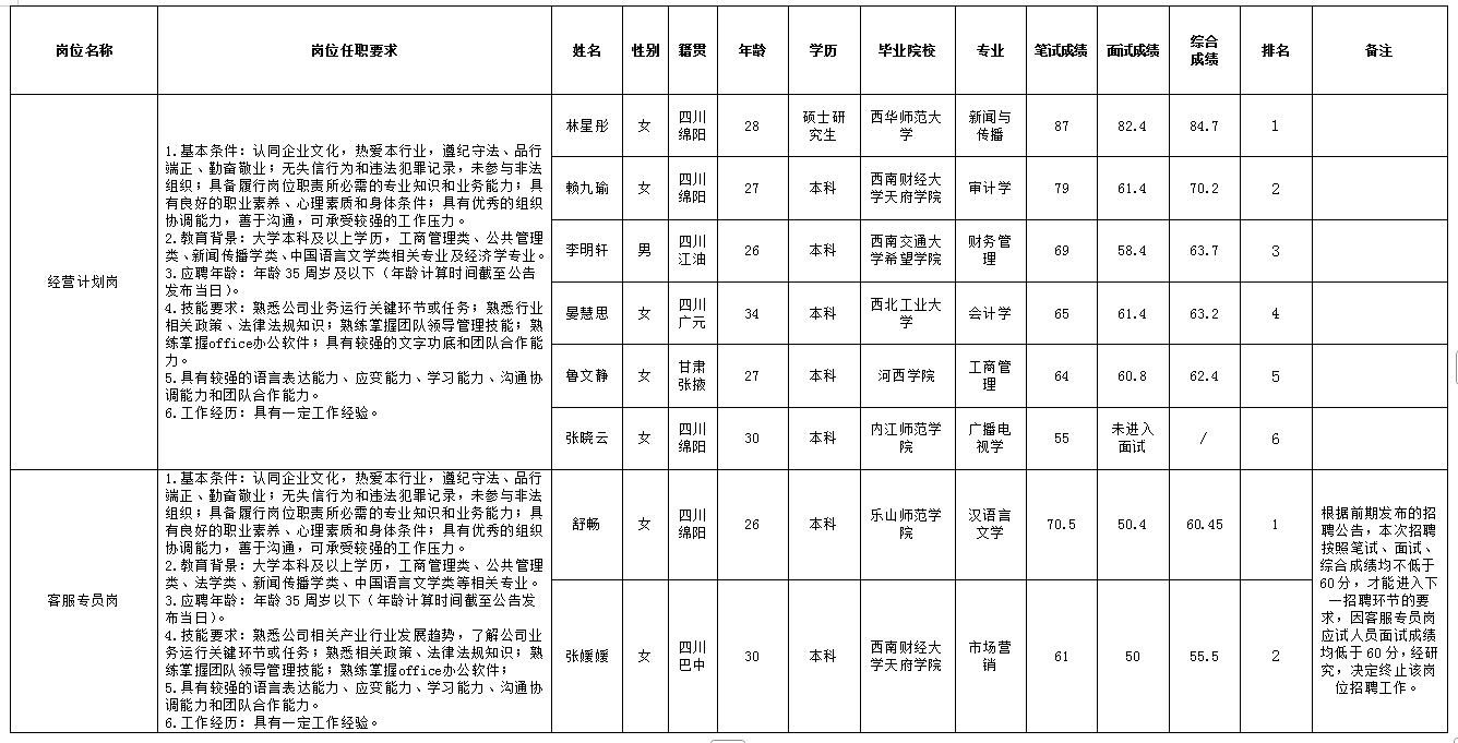 根據(jù)綿陽(yáng)市城市停車管理有限公司發(fā)布的招聘公告及招聘相關(guān)規(guī)定,經(jīng)筆試、面試等程序,現(xiàn)將筆試(面試)成績(jī)予以公示。