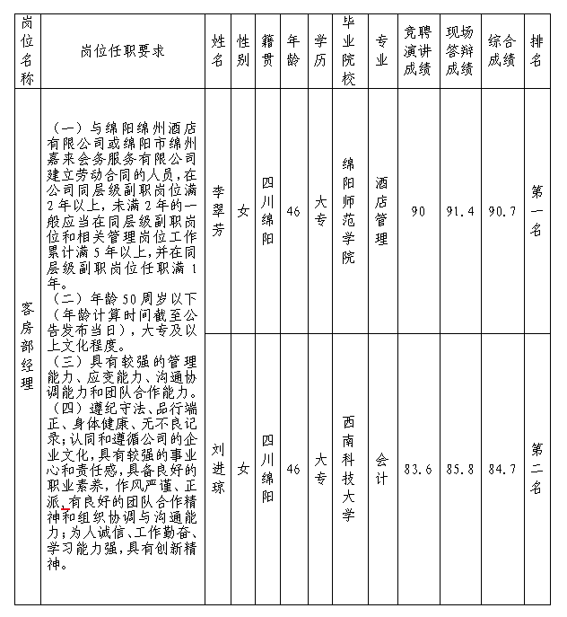 根據(jù)綿陽市綿州嘉來會(huì)務(wù)服務(wù)有限公司發(fā)布的招聘公告及招聘相關(guān)規(guī)定,經(jīng)競(jìng)聘演講、現(xiàn)場(chǎng)答辯等程序,現(xiàn)將競(jìng)聘成績予以公示。