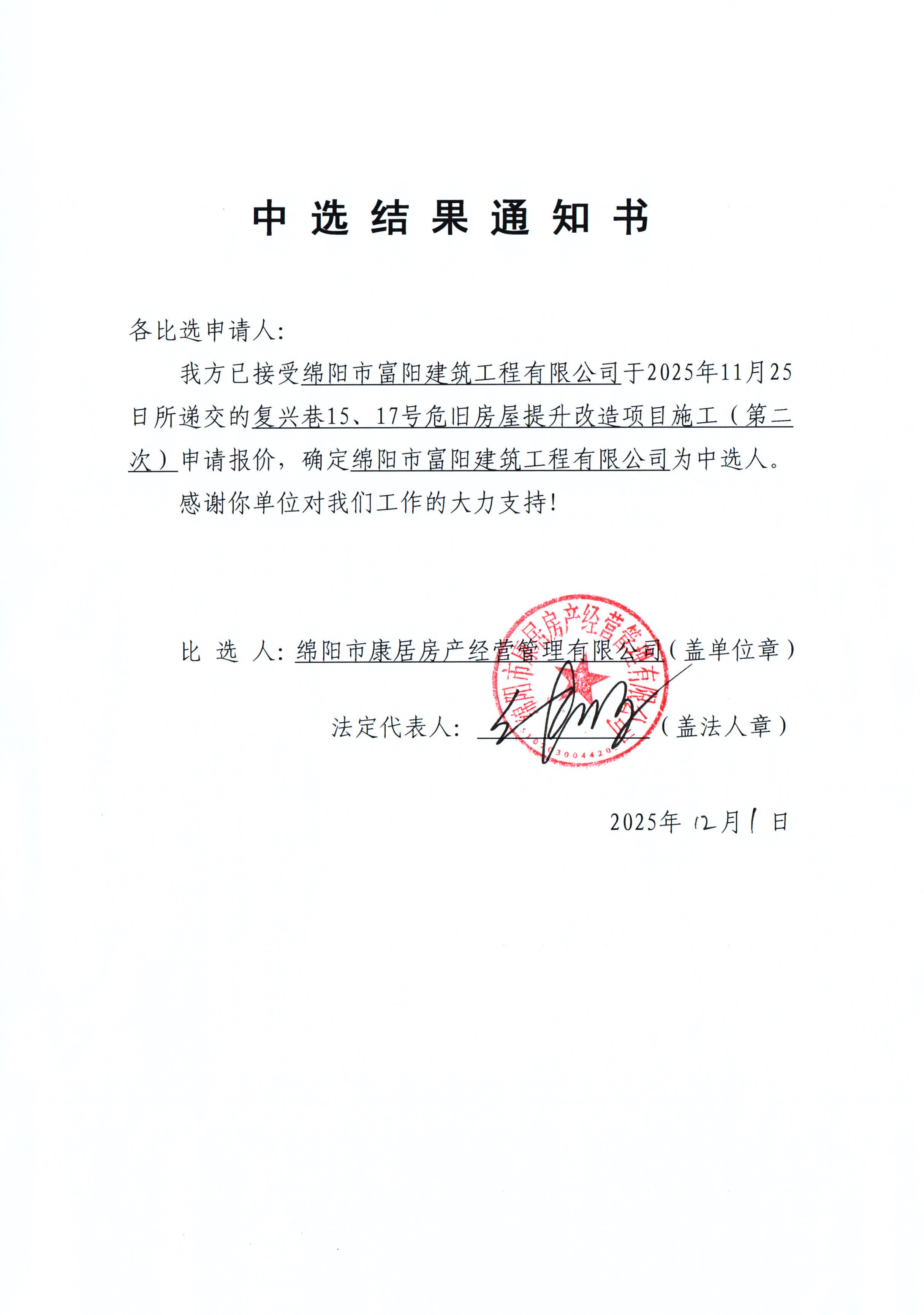 復(fù)興巷15、17號危舊房屋提升改造項(xiàng)目施工(第二次)中選結(jié)果通知